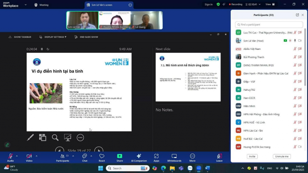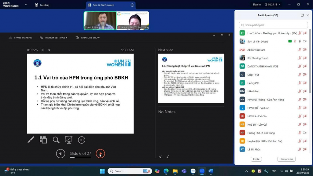 Trong chương trình, các chuyên gia của GFCD đã chia sẻ kết quả khảo sát, phân tích vai trò và kinh nghiệm của Hội Liên hiệp Phụ nữ Việt Nam trong ứng phó với biến đổi khí hậu; đồng thời tham vấn về Dự thảo Kế hoạch hành động nhằm triển khai hiệu quả Chiến lược quốc gia về biến đổi khí hậu giai đoạn 2021 – 2030, tầm nhìn 2050.